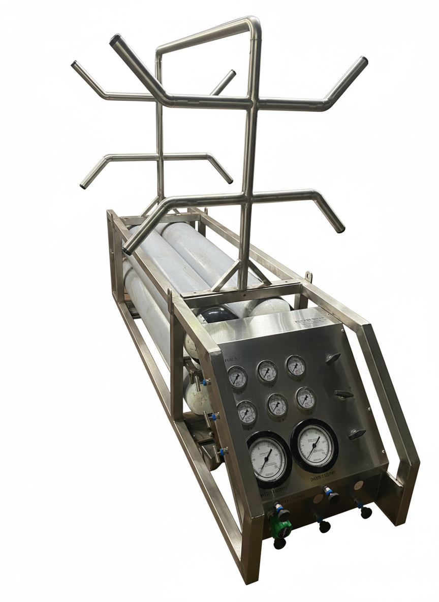 The Two Diver Scuba Replacement Package (SRP) is a compact, fully integrated surface-supplied air system designed to replace traditional scuba for commercial diving operations. Built on a robust SS 316 stainless steel frame, the SRP delivers a reliable, controlled air supply for two divers while offering excellent durability, portability, and compliance with IMCA requirements. The stainless-steel frame houses four 50-litre 200 bar breathing air cylinders, directly connected to a high-quality air management panel with an external charging point. This feeds into a compact two-diver air panel’